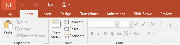The Home tab holds the Cut and Paste features, Font and Paragraph options, and what you need to add and organize slides.